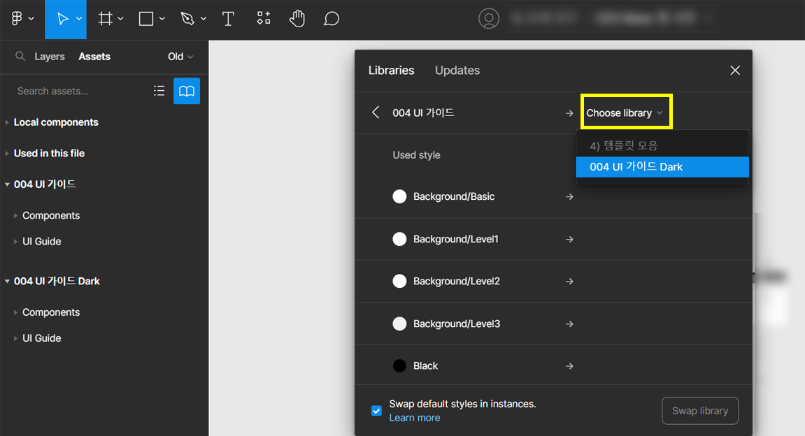 1) 라이브러리 스와이프 : 피그마에 라이트와 다크모드 UI 라이브러리를 만들어 퍼블리싱한 후 해당 페이지에 있는 모든 프레임의 컬러 모드를 변경하는 방식
