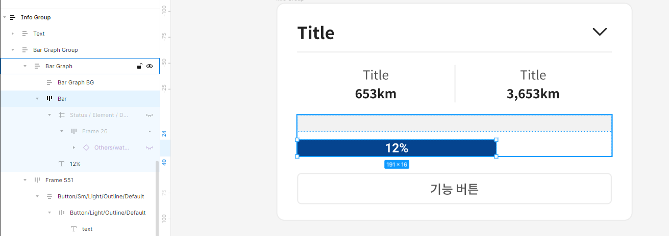 먼저 피그마에서 요소들을 Auto Layout (Shift + A)을 입혀줍니다. 특히 배경이되는 요소, 즉 아래에 깔릴 요소에는 무조건 오토레이아웃이 되어 있어야합니다. 하기 예시이미지에서는 Bar Graph BG가 배경이 되는 요소이고 Bar가 위에 띄울 요소입니다.