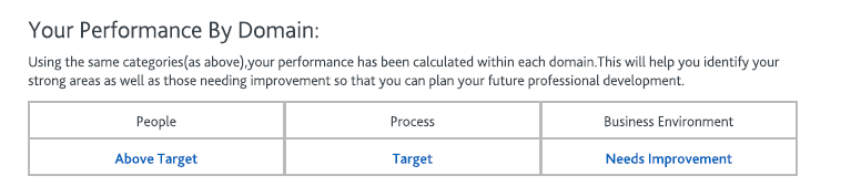 제가 체감했던 난이도와 거의 비슷하게 나왔습니다. 시간 분배가 조금 더 안정적이었다면 결과가 달라졌을 수도 있겠다는 생각은 들지만, 세 개 도메인 중 하나가 Needs Improvement이고, 하나 이상이 Above Target이면 합격이 가능하기 때문에 다행히 합격할 수 있었습니다.