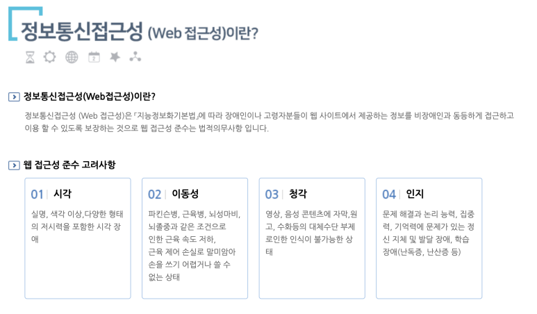 웹접근성인증평가원에서 소개하는 내용을 보면 장애인/고령자분이 쉽게 사이트에서 제공하는 정보를 비장애인과 동일하게